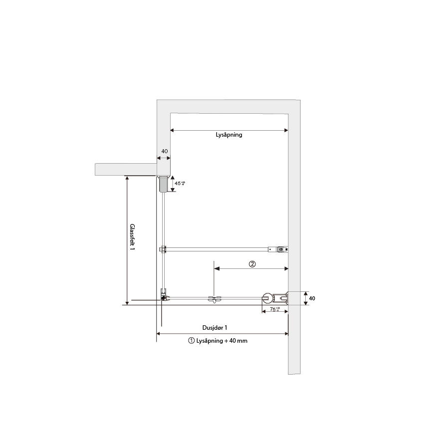 Hjørne med fast glassfelt og dusjdør